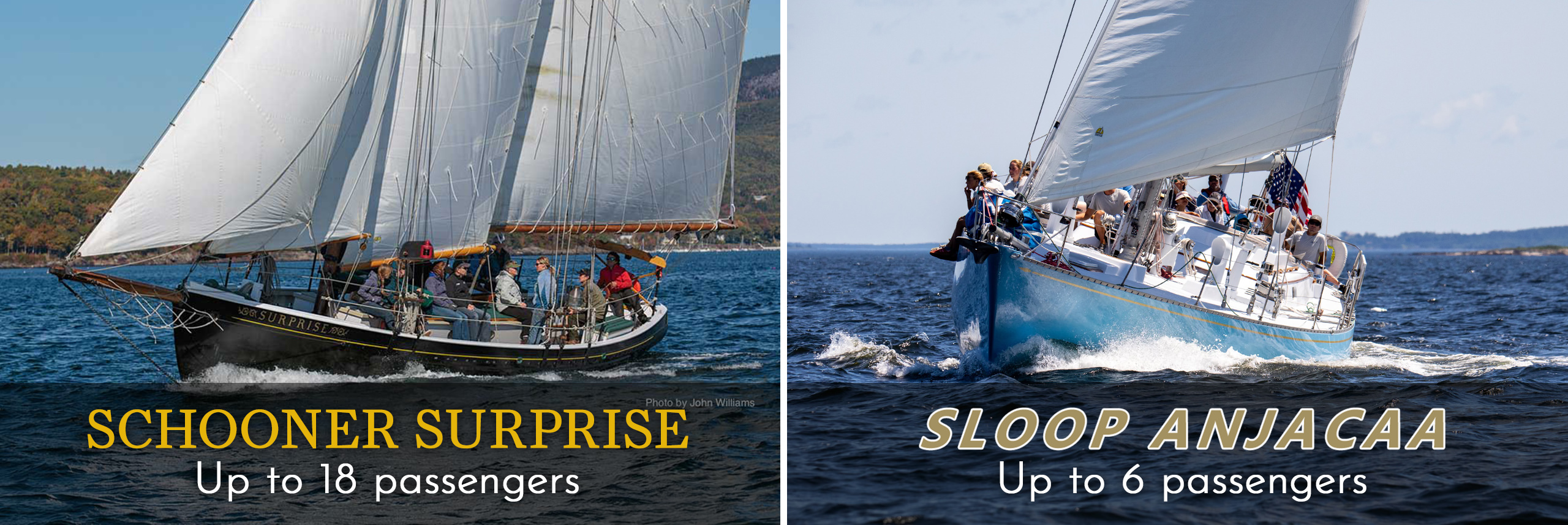 Join us for a two hour daysail on the elegant Schooner Surprise or Sloop Anjacaa out of Camden, Maine. Surprise and Anjacaa sail around the magnificent Penobscot Bay.